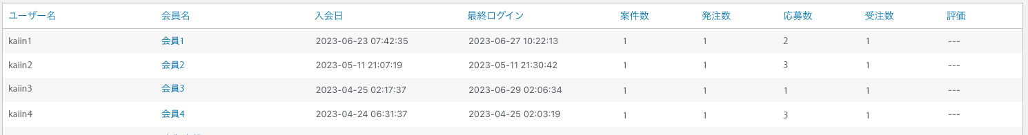 ユーザー名、会員名、入会日、最終ログイン、案件数、発注数、応募数、受注数を確認できます。