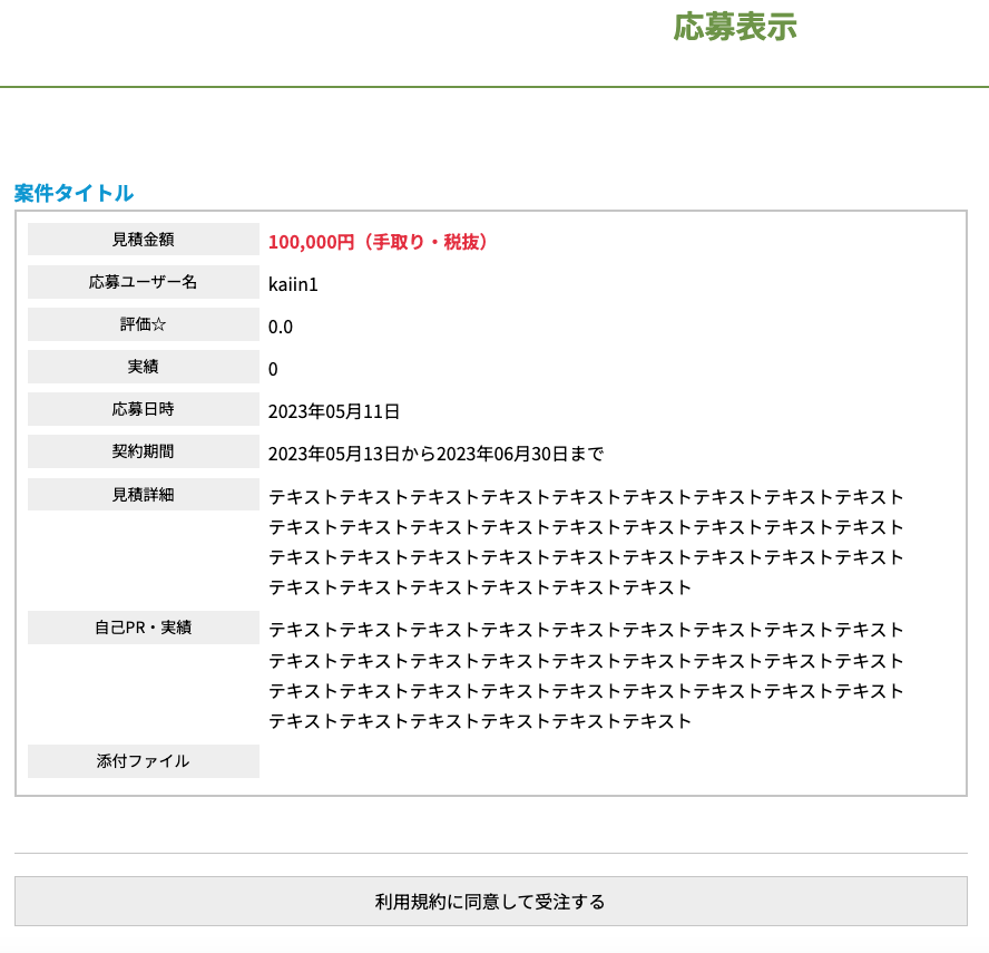 応募し発注された案件の詳細が表示されますので、内容を確認し【利用規約に同意して受注する】ボタンをクリックします。