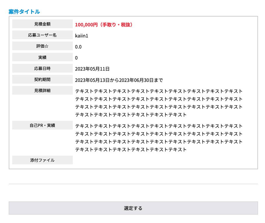 【選定する】をクリックすると該当案件への応募が選定され発注することができるようになります。