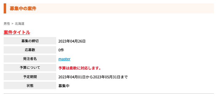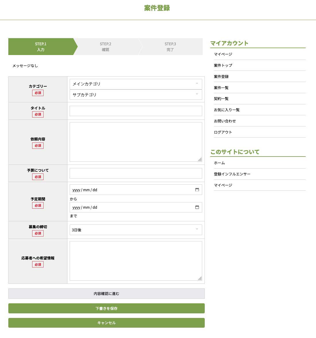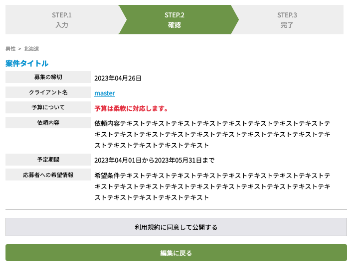 入力内容を確認し【利用規約に同意する】をクリックすると登録案件が公開されます。