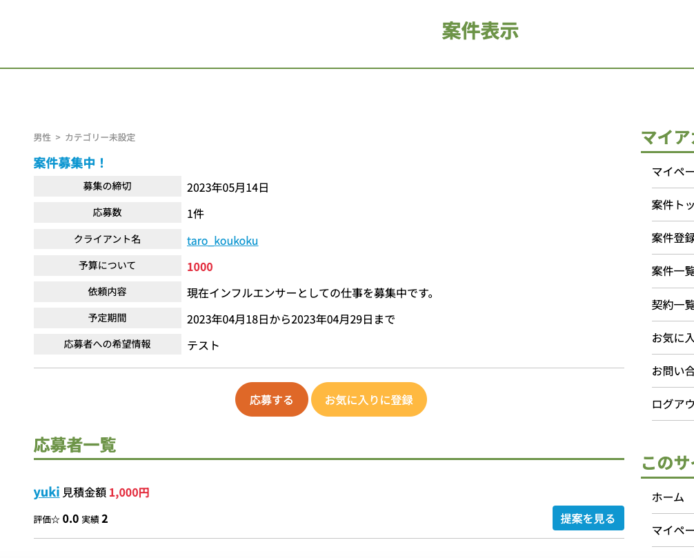 案件一覧表示から閲覧したい案件のタイトルをクリックすると、その案件の案件詳細ページが開きます。