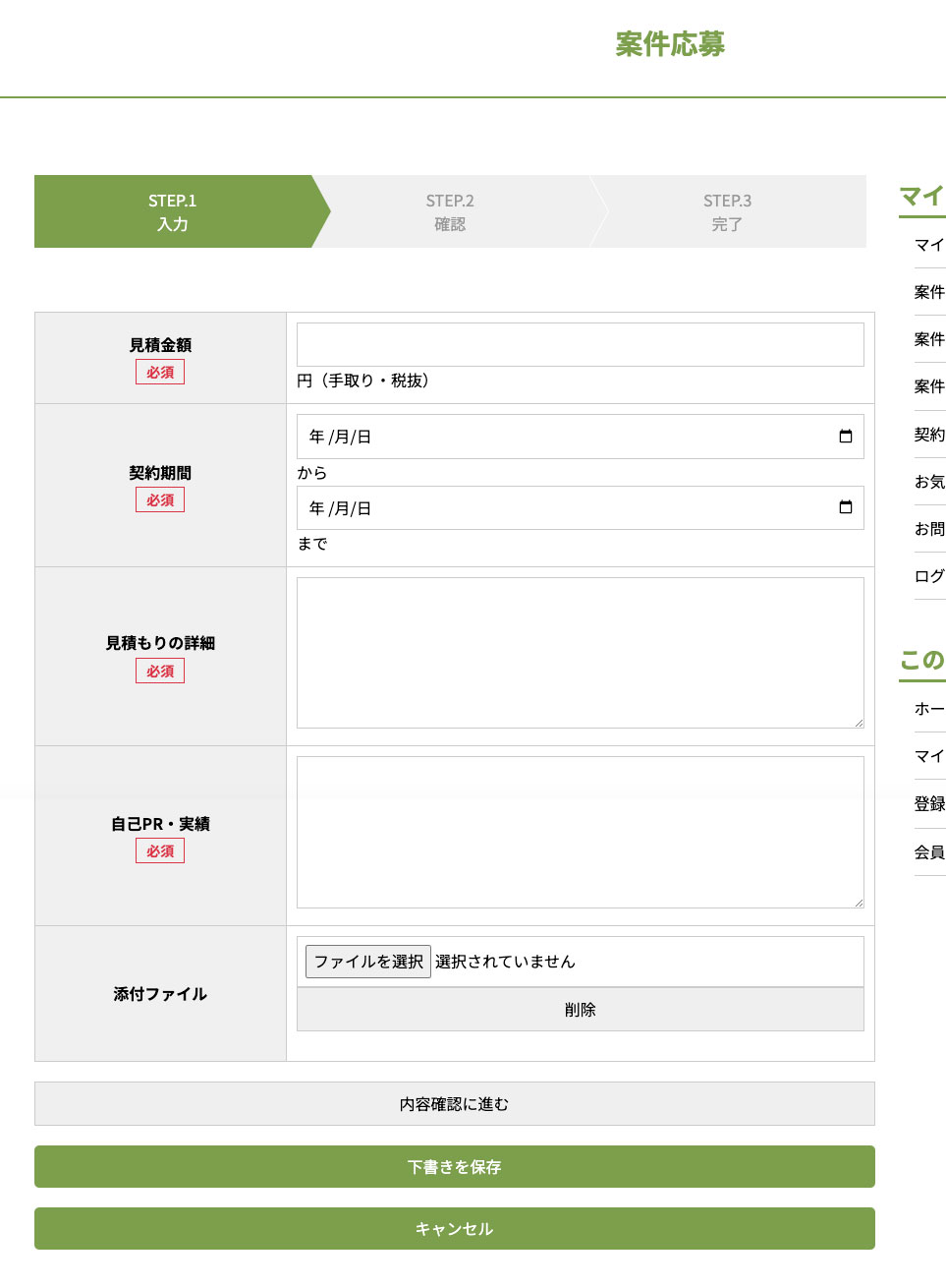 案件応募ページでは、提案金額、期間、自己PRなどを入力します。